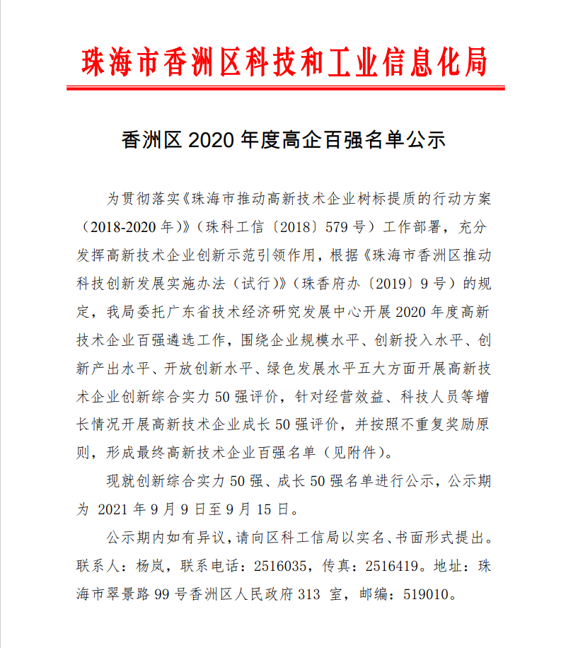 珠海市香洲区科技和工业信息化局发文公布《香洲区2020年度高企百强名单公示》。珠海灵科自动化科技有限公司(以下简称灵科超声波)荣获“香洲区2020年度高新技术企业成长50强”。