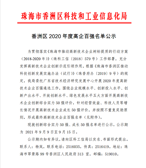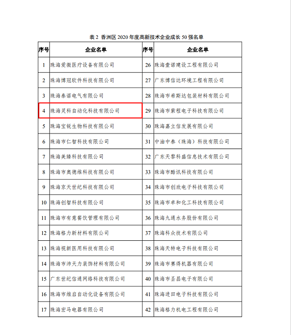 珠海市香洲区科技和工业信息化局发文公布《香洲区2020年度高企百强名单公示》。珠海灵科自动化科技有限公司(以下简称灵科超声波)荣获“香洲区2020年度高新技术企业成长50强”。