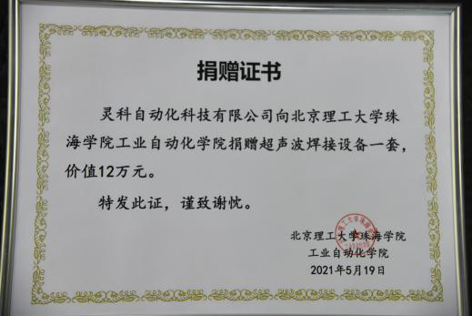 2021年5月19日,灵科超声波向北京理工大学珠海学院工业自动化学院捐赠价值12万元的超声波焊接设备一套,同时配备专业操作人员进行器械相关培训 ,旨在推动超声波焊接知识进入校园, 促进新一代大学生对于当前超声波焊接最先进技术的理解与运用。