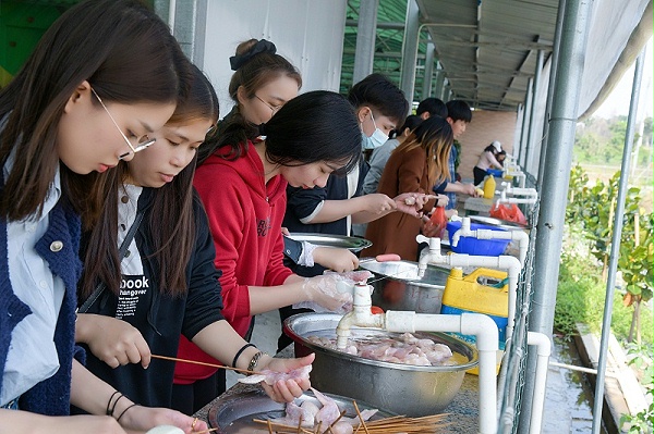 食材到达后齐刷刷上手,清洗食材,准备餐具,串肉上签,扒蒜切菜再剁肉......灵科家人们在烧烤架前各显神通。点火的,刷油的,调制调料的......烧烤现场繁忙而又井然有序。